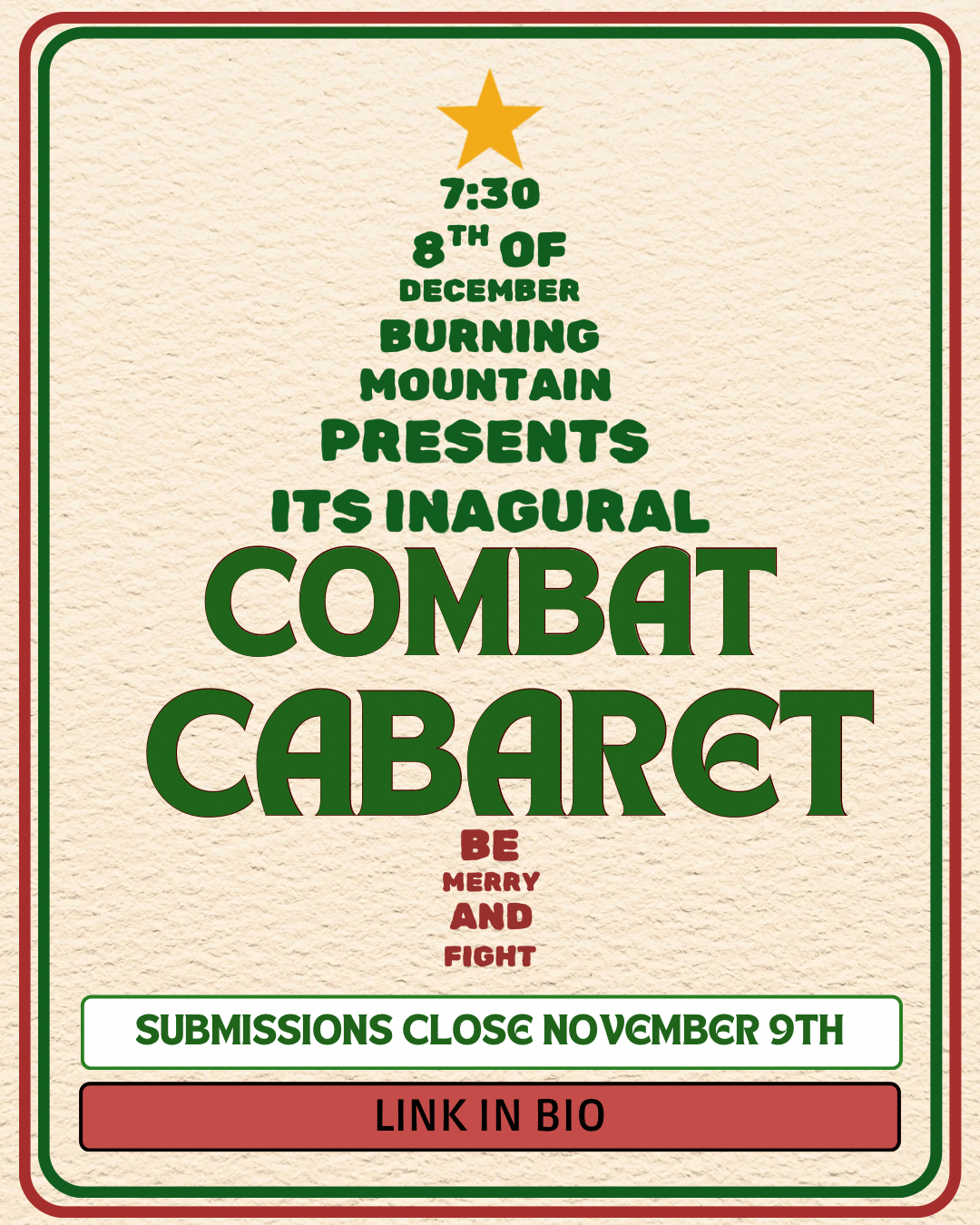 Combat Cabaret A celebration of stage combat and community!Share your newest creation, or simply enjoy the action and some holiday cheer.Tickets on sale November 24, 2025Click the link to apply for a performance slot. Due November 9, 2025, 11:59 pm. Application Form